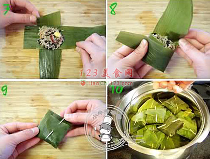 6、粽叶有新鲜的最好,干的粽叶要洗净后加入足量的水泡过夜才能使用,包任何一种样子的粽子,口要收紧,但粽叶不要拉的太紧,因为糯米蒸熟以后会涨发,以免撑破粽子,影响味道和美观。