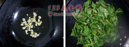 3、放入菠菜煸炒几下,放精盐,略有汤汁时,投入味精,拌和均匀,装盘即成。