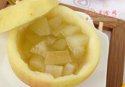 7、蒸好以后从蒸锅中拿出来,晾到温热的时候就可以吃了,可以连苹果盅一起吃掉哦!