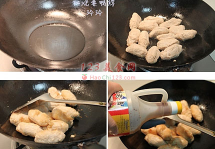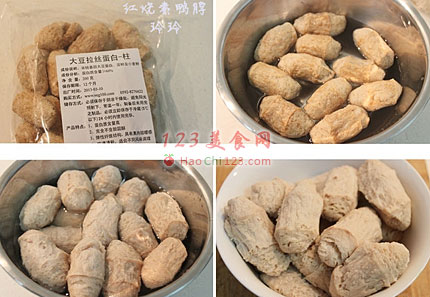 2、起油锅,倒入泡开的大豆蛋白,稍煎片刻。
