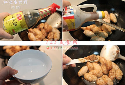 3、加生抽2匙,老抽1匙,盐少许,糖3匙,半碗水。