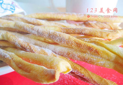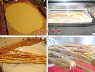 4、把面团擀成薄片,切成条。然后可以扭成螺旋状,或者滚成小棍棍,放在铺好油纸的烤盘上。