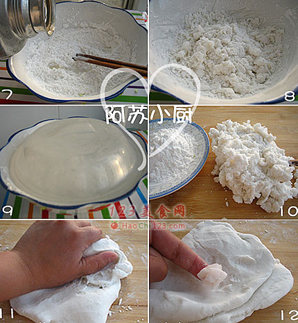 3、取烫面在案板上揉呀揉,分几次加入剩余的20克淀粉。