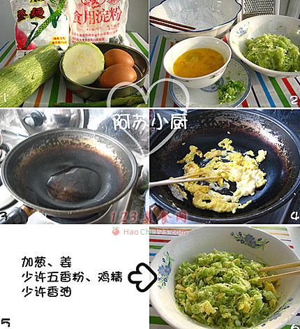 2、鸡蛋打散,放入油锅,炒熟,加入西葫芦馅中。