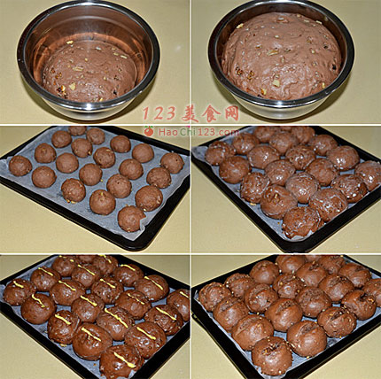 3、发酵完成的面团排气后分成大小均匀的20份,滚圆直接放于烤盘中放温暖处发酵。