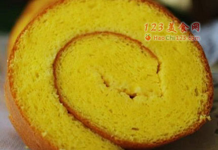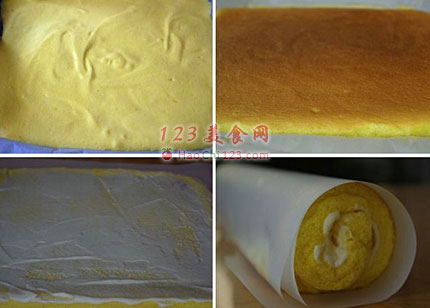 9、稍放凉后,把高温油纸放在蛋糕上,翻身,撕去烤纸,抹上打发好奶油,卷成蛋糕卷就OK了。