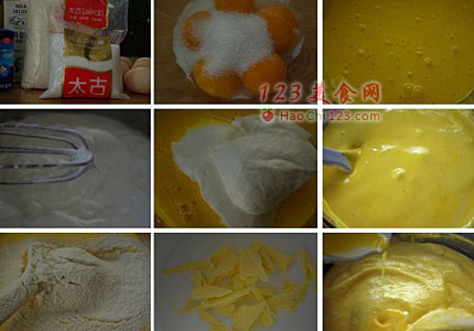 5、预热烤箱180度。分二次放入其余的蛋白,切拌均匀。