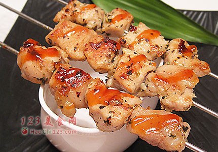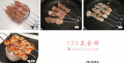 2、鸡肉串烧外表香酥,里面肉质细嫩,用平底锅煎制出来的鸡肉串足可媲美烤箱烤制出来的肉串。