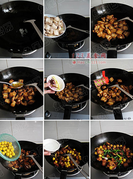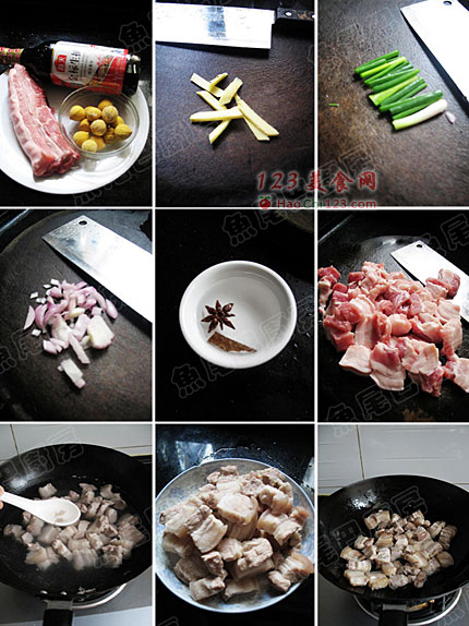 9、锅洗净热锅,下油,将五花肉翻炒一会,以逼出部分油后铲起备用。