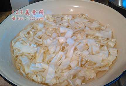 6、10分钟后,去掉盐水,用水冲洗卷心菜去除多余的盐水,快速沥干水分。