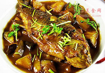 2、鲫鱼炖茄子是一道东北风味的家常菜。其营养丰富,味道鲜美,还很下饭哟!菜中我运用的是鲫鱼个头比较大,鲫鱼肉质细嫩,肉味甜美,营养价值很高,并含有大量的钙、磷、铁等矿物质。具有和中补虚、除湿利水、补虚赢、温胃进食、补中生气之功效。茄子性味苦寒,有散血瘀、消肿止疼、治疗寒热、祛风通络和止血等功效,可治疗内痔或大便出血、雀斑、汗斑、乳头皲裂、口腔糜烂等。