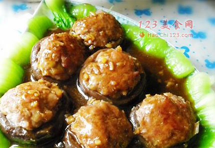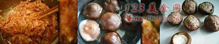 4、将肉馅嵌入香菇的包儿内,压实。