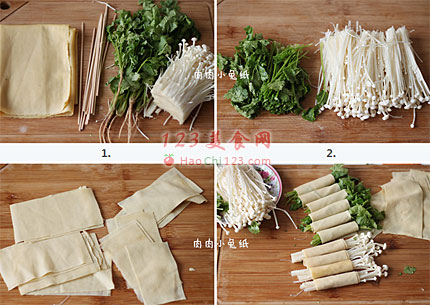 4、取一张豆腐皮卷一点金针菇或者香菜,不要卷的太多。