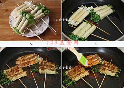 6、平底锅里倒入适量的油烧至6成热,中火放入豆腐皮金针菇卷,稍微煎一会,有点微黄。