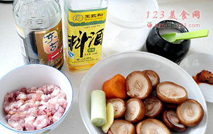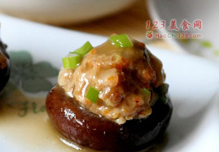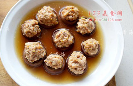4、将打好的肉馅放到香菇碗里,香菇入蒸锅内,大火烤开后转中火蒸10分钟。