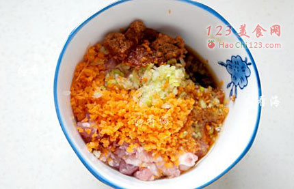 2、将胡萝卜、葱、姜切成碎末、酱油、料酒、糖、盐适量、半块豆腐乳一起放到肉馅里。