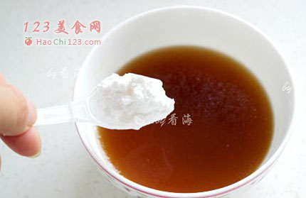 5、蒸好的香菇汤汁倒出,加一勺淀粉和匀备用。