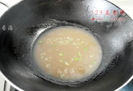 6、锅入少许油,爆香葱花后倒入调好的淀粉糊,转中火不停搅拌至粘稠状。