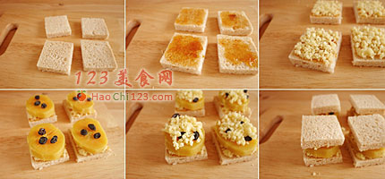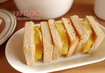 2、取一片全麦面包,在面包上抹上一层杏酱,接着撒一些奶酪碎,把蒸熟的红薯片放在上面,再撒适量葡萄干,最后再撒一些奶酪碎,用另外一片面包盖住。