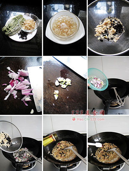 7、大火爆香后,加入沥干水分的虾皮豆豉。