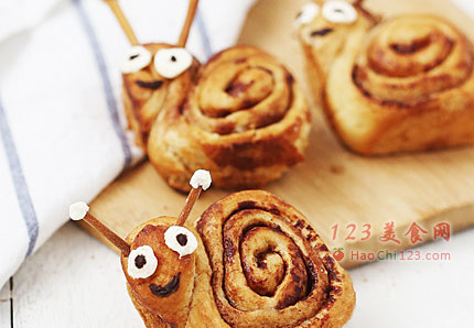 9、晾凉后用细面条做触角,奶酪和巧克力画上眼睛。