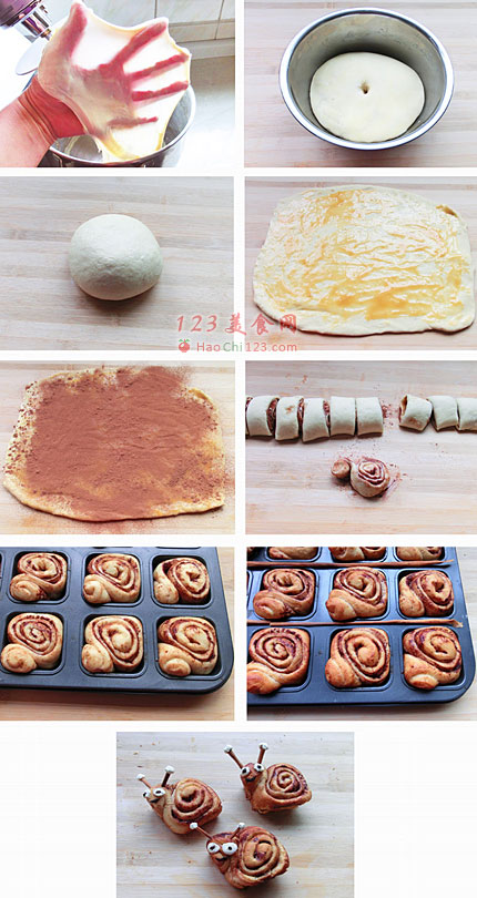 8、搓两根细面条,留做蜗牛触角。第二次发酵完毕后,刷一层蛋液。烤箱预热210度,烤13分钟左右。