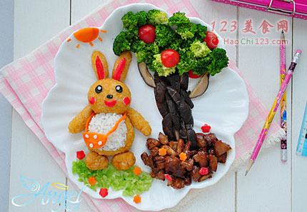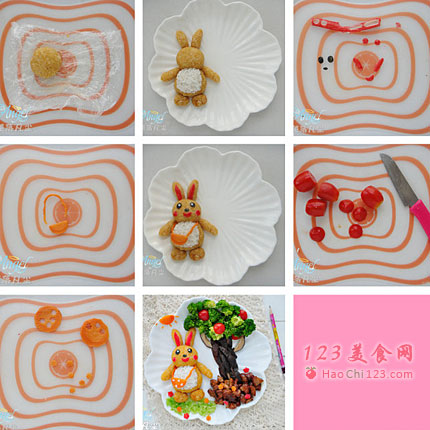 17、香菇和西兰花组合成树,鸡腿肉做土,小番茄做苹果,切掉点西兰花杆切碎放在小兔子下面做草地。