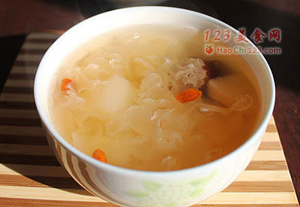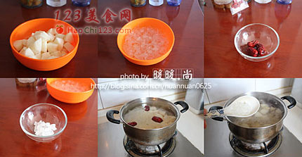5、将切好雪梨块、小朵的银耳和大枣放入汤锅,加水煮至银耳发软,汤发粘。