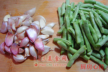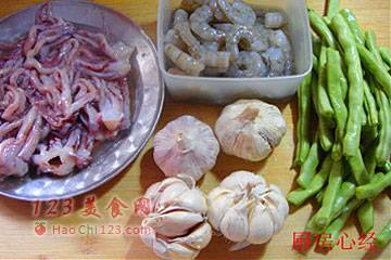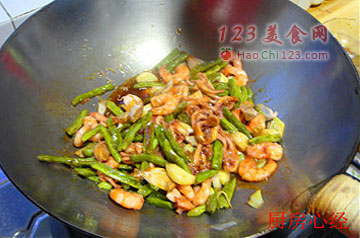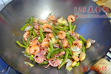 9、另起锅,放入已经炸熟的毛蒜和豆角,再放入已经炸熟的虾仁和鱿鱼须子翻炒均匀。