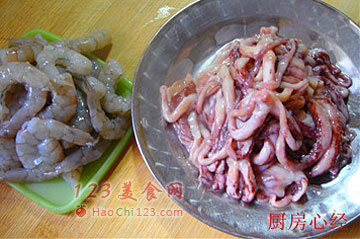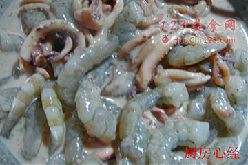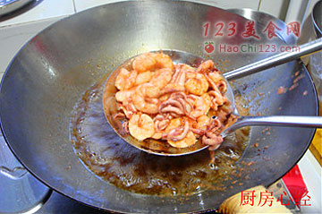8、再放入已经上浆的虾仁和鱿鱼须子滑油。