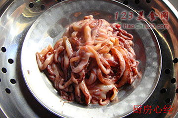 4、鱿鱼须子放在容器中蒸制,冒气即可拿出,不到一分钟,否则容易嚼不动。