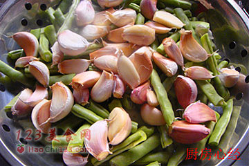 5、然后,将豆角和毛蒜放入容器中,上汽后蒸制三分钟。
