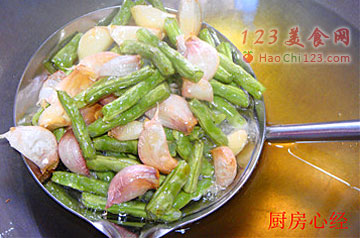 7、锅中做宽油,4成热,放入蒸熟的毛蒜、豆角炸制成熟。