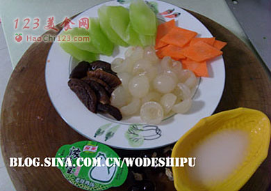2、龙眼去壳,去核;胡萝卜切成菱形,香菇浸泡后对半切开。