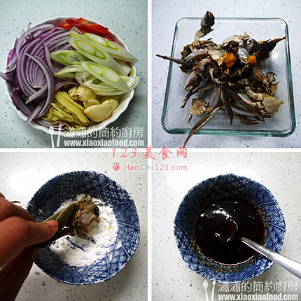 2、在螃蟹切口处沾上干淀粉能帮助保留蟹肉水份,吃起来汁液丰富肉质细嫩。
