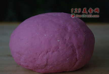 2、紫苋菜汁加到面粉中,再加盐(也可以不加),彻底揉匀成很硬的面团,放入保鲜袋中醒至少30分钟,或者1小时,中间可以取出再揉一次。