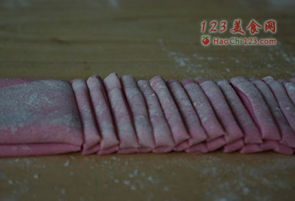 3、醒好后的面团直接擀成厚度低于2mm的面皮,照图上的样子折叠,直接切成条状即可。擀面皮和折叠时多撒点干面粉防止粘连,如果面板不够大,需要在擀面前把面团分成两块,分别操作。