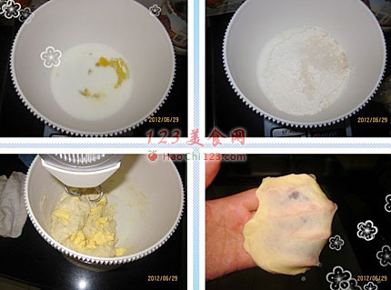 3、松驰好的面团碾成长舌状,铺上适量蜜红豆,再由上往下卷成圆柱形(面团很粘,涂了油在大理石面上,好不容易整好形)。