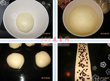 2、揉好的面团放进盆里,放温暖处发至2.5倍大,取出后排气,分成二等份,分好揉圆放一边松驰15分钟。