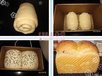 4、卷好的面团放在吐司模里,再放到温暖处发至八分满。表面喷水,撒上一点黑芝麻。
