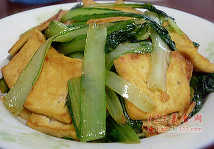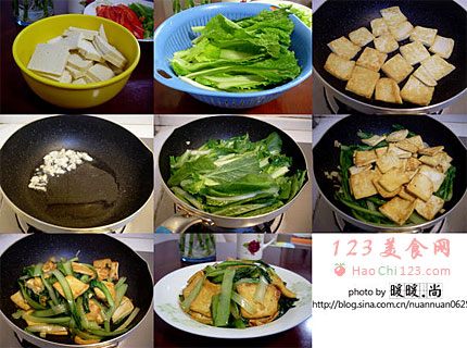 5、待小白菜断生后再放入煎好的豆腐翻炒。