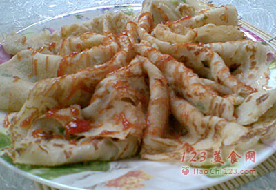 4、将锅烧热放入少许油(一点点就可以),舀一勺稀糊放在锅内,将锅离火快速转一下,用铲子摊成薄饼(如果技术相当凑合的话基本上就用不到铲子了),将一面煎成金黄以后翻面,将另一面也煎成金黄色就好拉。