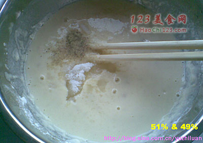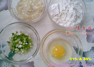 2、将面粉放在盆中,打入鸡蛋,放入香蕉泥,加入少许葱花,放入少许白糖,一点点盐(主要是因为要做成甜口的,所以盐不能多放)一点胡椒粉。