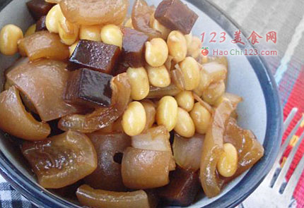 5、将煮好的肉皮切成丁。红咸菜切手指肚大小的粒(再用清水泡一下,冲洗两遍),白菜帮也洗净切成丁备用。