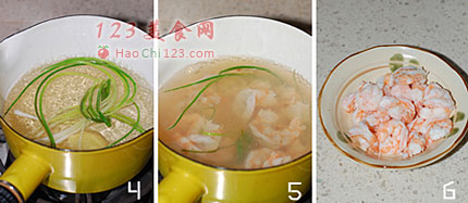 5、倒入虾仁煮开,变色后立即关火(虾入锅的时间不要长,保持鲜嫩)。