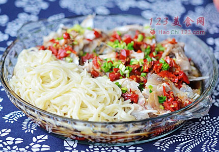9、把鱼块稍移动一下,放上煮好的面条即可。