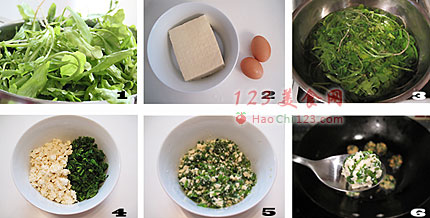 4、将荠菜切成碎段,挤出多余水分放入碗中,豆腐丁入碗。