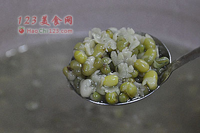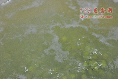 2、经过浸泡,绿豆膨胀了一些,更容易被煮熟。将绿豆冲洗2-3遍,倒入锅中,加入适量水,煮开后转中小火继续煮。相比用来喝的绿豆汤,做绿豆冰棒的绿豆汤,水量要少一些,这样绿豆味儿才会浓。