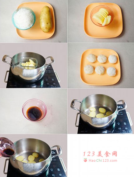 6、另起锅将蒸好的土豆放入锅内两面稍稍煎一下,倒入调好的汁入味。