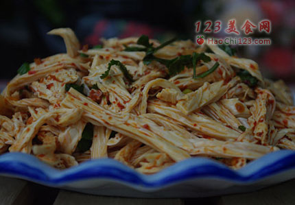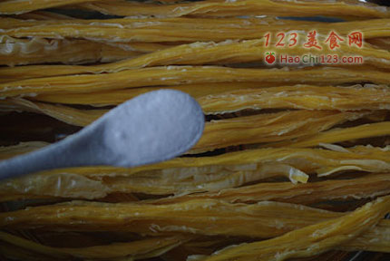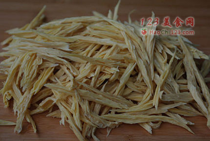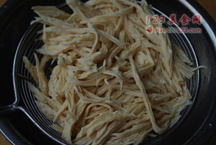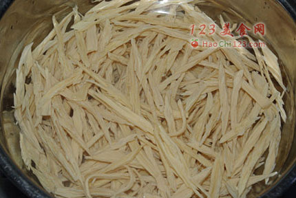 3)基本泡发后,切成细丝再在温水中泡二十分钟,泡出来的腐竹就相当完美了。